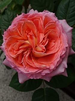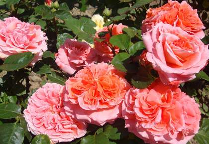 Окраска бутонов очень яркая и оригинальная: такой цвет чаще всего называют "лососевым" (смесь нежно-оранжевого с розовым). Цветки очень пышные, до 12 см в диаметре, и на фоне куста с высотой не более 120 см смотрятся очень эффектно. Лепестки плотно прилегают друг к другу, образуя плотную наполненную чашу. Аромат тонкий, немного терпкий, с ярко выраженными нотками цитруса и других экзотических фруктов. Ширина куста — до 80 см, лист темно-зеленый, с характерным глянцевым отливом.
