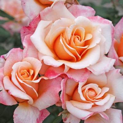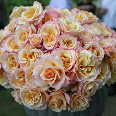 Роза Oh Happy Day (Оу Хэппи Дэй). Чайно-гибридная роза с густомахровыми кремово-абрикосовыми цветками, собранными в небольшие соцветия, с лёгким ароматом. Цветение повторное, обильное. Куст изящный, компактный, вертикальный, высотой до 120 см, с листвой, имеющий высокую устойчивость к заболеваниям и высокую морозостойкость (ADR-2013).