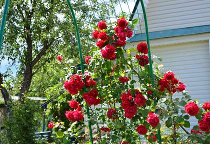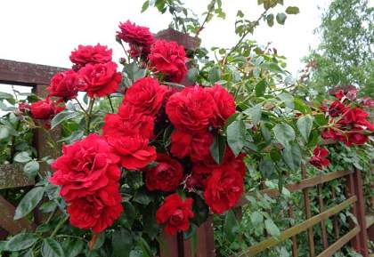 Роза плетистая Orfeo (Орфео). Роза цветет чрезвычайно обильно! Цветки бархатные, до 10 см в диаметре, бордовые, бархатистые. Листья нарядные, блестящие. Отлично нарастает, не болеет. Устойчива к осадкам, не выгорает. В прохладную погоду изысканно пахнет. Долго держит цветы, подходит для жаркого климата.