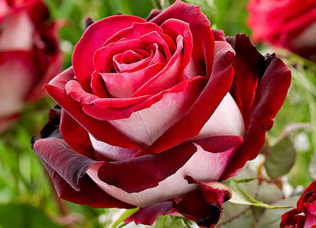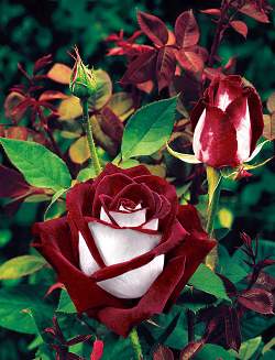 Роза Osiria (Осирия). Потрясающая роза. Лепестки с внутренней стороны бархатистые, темно-красные, с внешней — серебристо-белые. Имеет сильный аромат, густой и сладкий. Очень красива как в полуроспуске (бокаловидная форма), так и полностью раскрывшаяся (чашевидная форма).