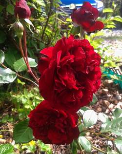 Красивая и надежная роза. Темно-красные махровые цветы распускаются в больших соцветиях на крепких высоких побегах без перерыва в течение сезона. Каждый цветок держится около 10 дней. Цветки в соцветия по 3 штуки и больше. Листья темно-зеленые, блестящие, здоровые.