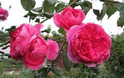 Цветки чашевидные, такие густомахровые, что под их весом часто гнутся побеги. Это хорошая черта, т.к. это означает, что дождь их не испортит, а мы сможем заглянуть внутрь цветка. Появляются по одному или в кистях до 5 шт. Листва обильная, темно-зеленая, устойчивая к заболеваниям. Куст сильнорослый и очень обильно цветущий. (ARE)