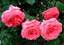 Роза чайно-гибридная Pariser Charme (Паризье Шарм). Цветок диаметром 10 сантиметров; в стадии бутона имеет насыщенный лососёво-розовый цвет, который по мере распускания лепестков становится мягко-розовым. Около 60-ти густомахровых лепестков скручены в плотную волнистую розетку. Она настолько плотная, что даже в полном раскрытии цветок не показывает середину.