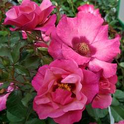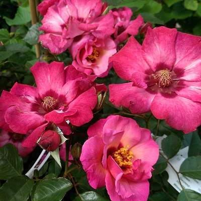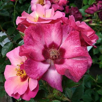 Роза Persian Eyes (Персиан Айз). Гибрид Hulthemia persica. Цветки розовато-сиреневые с фиолетовым глазком и золотистыми тычинками, собраны в соцветия до 10 шт. Цветки простые, 4-8 лепестков, диаметр до 7 см. Роза обладает легким ароматом.