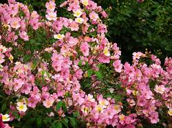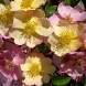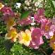 Роза Plaisanterie (Плезантери). Результат скрещивания розы сорта Trier и R. chinensis 'Mutabilis'. Оранжевые бутоны раскрываются в немахровые цветки, вначале желтые, позднее розовеющие, в полном роспуске малиновые с пурпурным тоном, ароматные.
