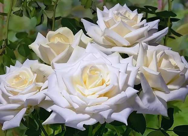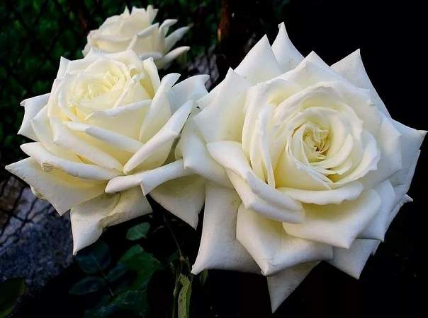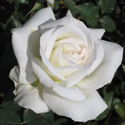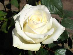 Роза чайно-гибридная Polarstern (Поларштерн). Бутон кремовый, либо цвета слоновой кости. В полураскрытом цветке в центре виден лимонный оттенок, но полностью раскрывшийся цветок сияющего белого цвета. Цветки густомахровые, лепестки изящно отгибаются вниз. Они очень плотные, так что сорт устойчив к дождю, бутон округлый и медленно раскрывается.