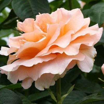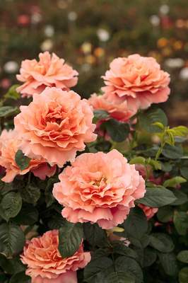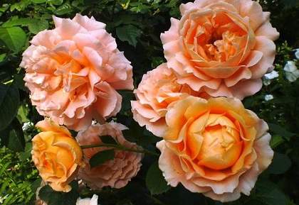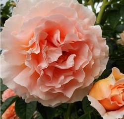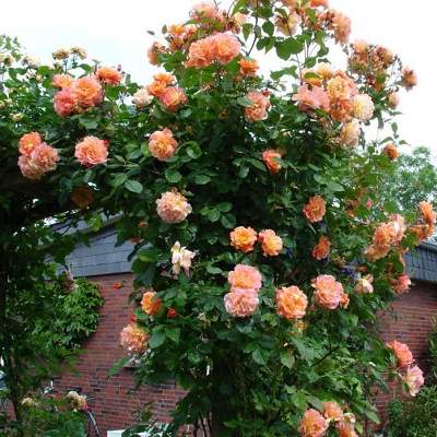 Роза плетистая Polka (Полька). Хотя Мейян и относит эту розу к плетистым, у нас она ведет себя скорее как шраб, в опоре особенно и не нуждается. Цветки потрясающе красивые, крупные (10-11 см), абрикосовые, с волнистыми лепестками, так что весь цветок выглядит кружевным и воздушным. Кисти крупные, целые букеты цветков разной степени яркости.