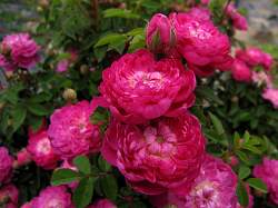 Роза Pompon de Bourgogne (Помпон де Бургонь). Куст невысокий, кустистый. Цветы глубокого розового цвета с пурпурным оттенком, некрупные, густо-махровые, преимущественно одиночные, чашевидной формы. Аромат сильный. Цветет однократно весной или вначале лета.