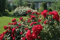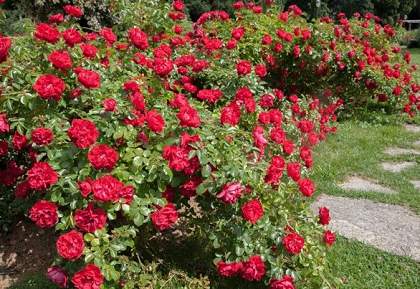 Роза шраб Prodige Ecarlate, Colossal Meidiland (Продиже Экарлат, Колоссаль Медийян). Эффектный малиново-красный цветок (24-27 лепестков), диаметром 7-8 см, прекрасно переносит жару и дождь. Цветы расположены в кистях по 5-15 шт. Листва тёмно-зелёная, плотная, устойчивая к болезням. Куст высотой 100-120 см.