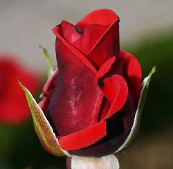 Роза Queen of Bermuda (Квин оф Бермуда). Чудесная роза настоящего алого цвета. Бутоны шириной в 3 см, а длиной в 5 см развиваются в крупные, до 13 см в поперечнике, цветки. Они скомпонованы из 35 лепестков киноварно-красного цвета, имеющих характерную черную тень на внешней стороне. Обладает приятным ароматом.