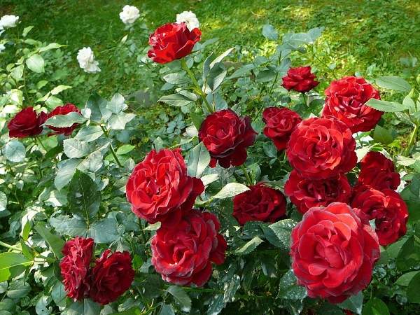 Роза Red Berlin (Ред Берлин). Цветки огромные, до 14 см в диаметре. Очень эффектная и элегантная срезочная роза, достаточно ощутимый тонкий классический чайно-фруктовый аромат, крупные цветы долго стоят в срезке, на кусте цветок держится больше двух недель. Имеет хорошее здоровье. Кусты прямые или слегка раскидистые высотой до 120 см. Цветение продолжается все лето.