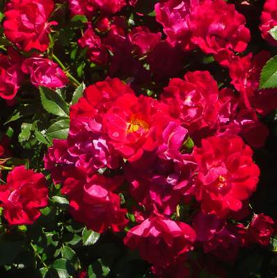 Роза шраб Red Drift (Ред Дрифт). Эта компактная почвопокровная роза особенно хорошо подходит для посадки в балконные ящики и в рокарии. Сорт очень выносливый, устойчивый к болезням, и цветет практически непрерывно все лето. Цветки красные с желтым основанием. Листва мелкая, очень густая.