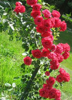 Роза Red New Dawn (Ред Нью Дон). Цветки ярко-красные, средние, махровые, ароматные, в крупных соцветиях. Кусты сильные, раскидистые. Листья темно-зеленые, кожистые, глянцевитые. Цветение обильное. Ремонтирует.