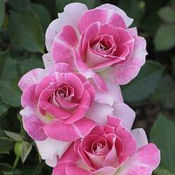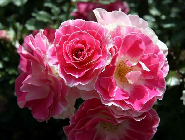 Роза Regensberg (Регенсберг). Цветки быстро распускаются, они ярко-малиновые или густо-розовые, слегка голубоватые, что резко контрастирует с белым центром и белыми потеками, которыми испещрены лепестки. Лепестков много, но цветки быстро показывают серединку и выглядят полумахровыми, с бледно-желтыми тычинками в центре. Появляются в плотных кистях на коротких цветоножках по 3-7 шт в кисти.