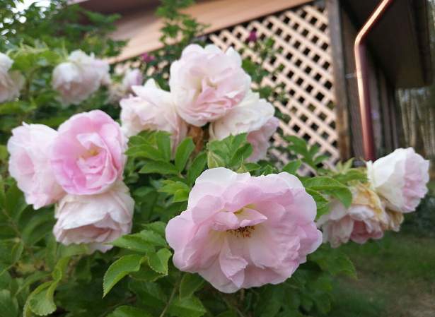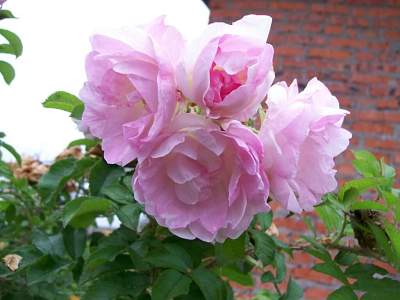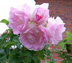 Роза Ritausma (Ритаусма). Гибрид ругозы. Цветки диаметром 5-8 см, махровые (25 лепестков), светло-розовые, выцветающие до кремово-белых, в соцветиях по 5-10. Аромат средний. Цветение повторное, двумя волнами. Листва ярко-зелёная, морщинистая, очень устойчивая к заболеваниям. Куст округлый, раскидистый, высотой и шириной 150-210 см. Побеги очень колючие. Зимует под устойчивым снежным покровом.