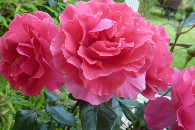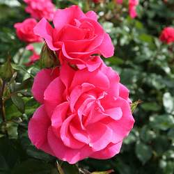 Цветки очень крупные, розовые, с очень темно-розовым реверсом лепестков, с легким ароматом. Цветки махровые, появляются по одному или в кистях по 5-15 шт, и превосходно смотрятся на фоте темно-зеленой листвы.
