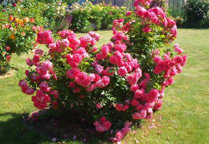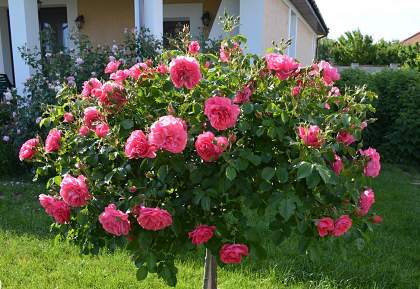 Роза Rosarium Uetersen (Розариум Ютерзен) на штамбе 80 см. Цветки густомахровые, с черепитчатым расположением лепестков, темно-розовые с серебристо-розовым оттенком, устойчивы к дождю и ветру, с легким ароматом. Оборотная сторона лепестков ближе к серебристо-розовому, и цветки немного выгорают с возрастом, что подчеркивает красоту новых цветков и кистей в целом.