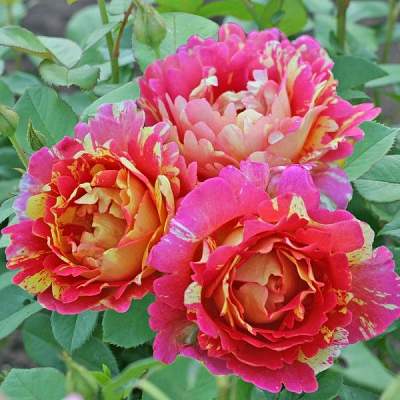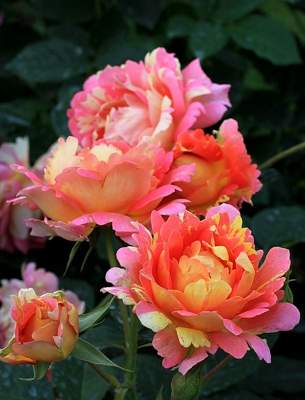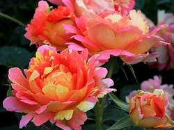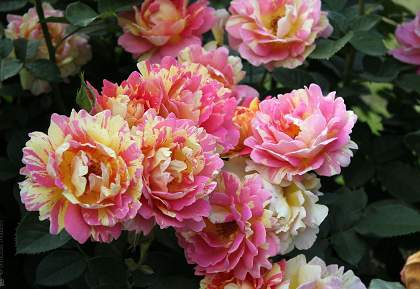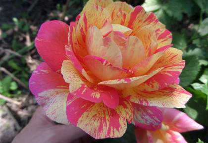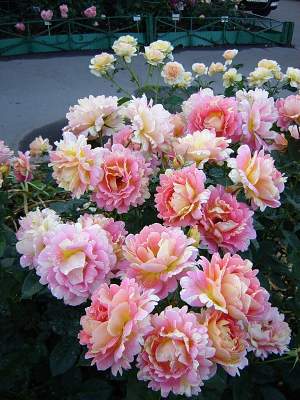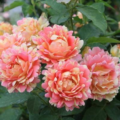 Роза шраб Rose des Cisterciens (Роз де Систерсьян). Цветки крупные (10 см), махровые, с тонкой штриховкой светло-желтого и насыщенно-розового цвета, с вырезными лепестками. Цветки пахнут цитрусами, розой и фруктами.