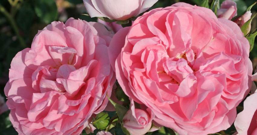 Роза Rosenfee (Розенфее). Роза с густомахровыми, при полном роспуске чашевидными нежно-розовыми цветками. Цветки диаметром 7-8 см, размещаются в кистях по 5-7 штук и распускаются из округлых, коралловых с тёмной каймой, бутонов. Аромат лёгкий.