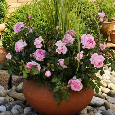 Роза Rosenfee (Розенфее). Роза с густомахровыми, при полном роспуске чашевидными нежно-розовыми цветками. Цветки диаметром 7-8 см, размещаются в кистях по 5-7 штук и распускаются из округлых, коралловых с тёмной каймой, бутонов. Аромат лёгкий.