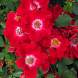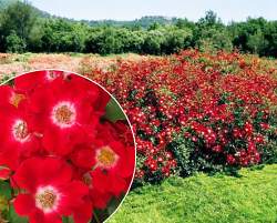 Цветки простые чашевидные крупные бархатно-красные с белым глазком и желтыми тычинками. Появляются в огромном количестве по всей поверхности куста в рыхлых кистях по 5-15 шт. За цветками следуют мелкие округлые алые плоды, но сорт быстро и обильно зацветает повторно, так что цветочное шоу продолжается до поздней осени.