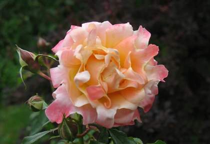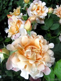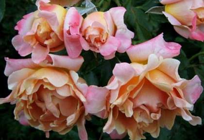 Роза флорибунда Ruffles Dream (Рафлс Дрим). Цветки до 8 см, густомахровые, с волнистыми изрезанными лепестками. Появляются в кистях по 2-5 шт. Цветение обильное и многократное с начала лета до осени. Куст прямостоячий, ветвистый, листва глянцевая, высота 40-50 см. Аромат лёгкий.