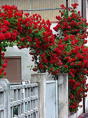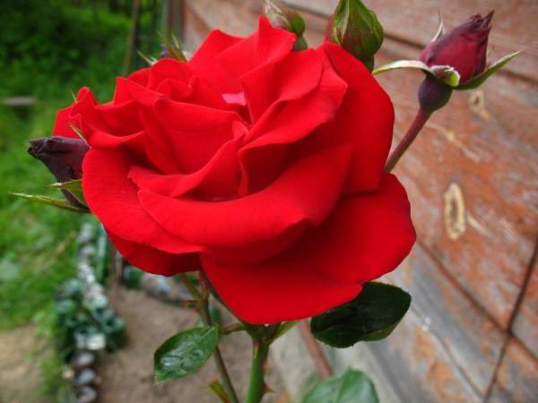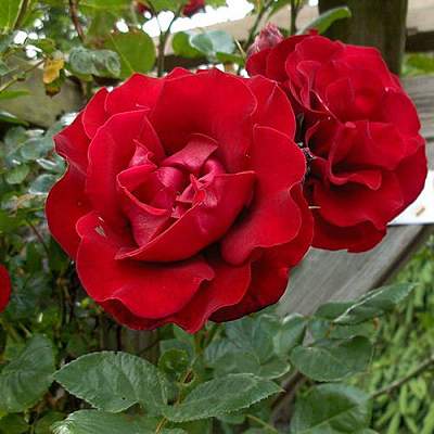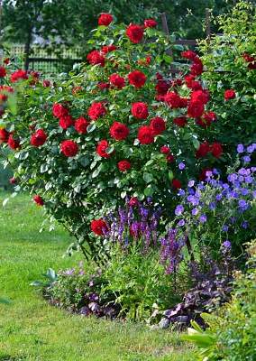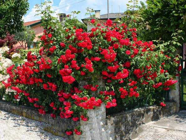 Роза плетистая Santana (Сантана). Блестящие листья и морозостойкость выдают то, что Santana — гибрид kordesii. Аромат практически отсутствует. Тем не менее, это великолепный и обильный сорт. Цветки полумахровые, хороши на всех стадиях роспуска. Они насыщенного, сияющего, кроваво-красного цвета, устойчивы к дождям, долго не увядают. Появляются в небольших кистях (как правило, 3-7 цветков), причем не только в верхней части куста, а по всем побегам снизу доверху.