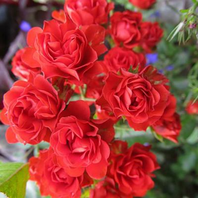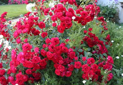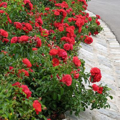 Роза шраб Scarlet Meillandecor (Скарлет Мейяндекор). Здоровье, сила роста, способность к адаптации и выносливость являются отличительными свойствами этого сорта. Цветки мелкие, ярко красные, с волнистыми лепестками. Куст фонтанообразный, побеги часто поникают под тяжестью цветков, округлой формы.