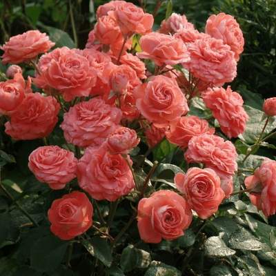 Роза флорибунда Schackenborg (Шакенборг). Очень стойкая, постоянно цветущая роза. Очаровательные чашевидные цветки лососево-розового цвета. Иногда цветки квартированные. Собраны в соцветия по 3 шт. Диаметр цветков до 10 см. Аромат легкий, яблочный.