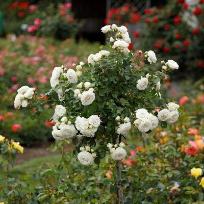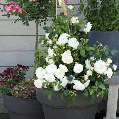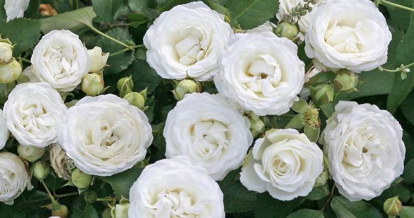 Роза Schneeküsschen (Шнеекюсшен). Компактно растущая роза патио. Цветы чисто-белого цвета, 3-5 см в диаметре, махровые, шаровидной формы, собираются в соцветия. Цветение повторное, обильное. Аромат отсутствует. Белые цветы прекрасно контрастируют с темно-зеленой листвой. Куст высотой 30-40 см, шириной 40 см.