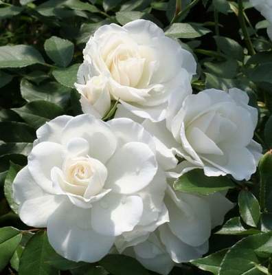 Роза Schneewittchen, Iceberg (Шнеевитхен, Айсберг). Цвет чисто-белый. Цветок размером 5 см, 17-25 лепестков. Цветы расположены в кистях. Обильно цветущий сорт. Куст среднего размера, ветвистый, пряморослый, высотой 75-150 см, шириной до 60 см. Глянцевая, светло-зелёная листва. Цветение флэшами весь сезон. Другие наименования (синонимы): KORbin, Fée des Neiges, Schneewittchen. Зимостойкость: зона 4b (−28.9 °C ... −31.7 °C ) по системе USDA.
