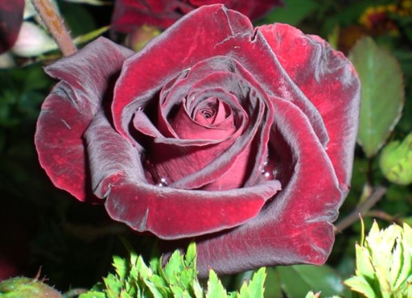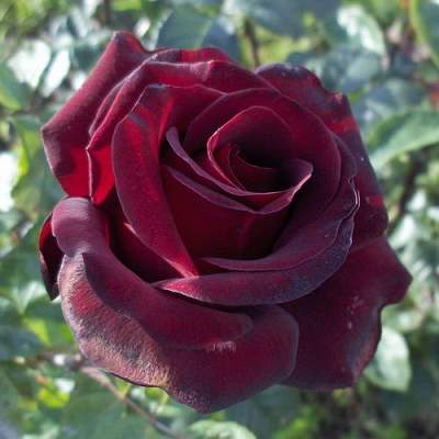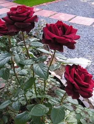 Роза чайно-гибридная Schwarze Madonna (Шварце Мадонна). Сильнорослая чайно-гибридная роза. К сожалению, Schwarze Madonna почти не пахнет. Тем не менее, во всем остальном это великолепный сорт. Цветки крупные, густомахровые, очень темного красного цвета, почти черные, словно бархатные, особенно снаружи. Они хорошо держат цвет, и сами цветки долго держатся на кусте и хорошо стоят в срезке. Появляются обычно по одному на концах сильных побегов.