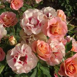 Роза Shiraz (Шираз). Гибрид гультемии персидской. Спрей-роза с необычной окраской. Цветки в зависимости от степени раскрытия цветка розовые, коралловые, персиковые, желтоватые, кремовые. Особенно красиво в глубине цветка мерцает темный глаз. Каждый цветок держится не менее двух недель. Аромата нет. Цветок простой или полумахровый (около 30 лепестков). Основная окраска темно-розовая.