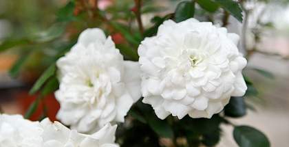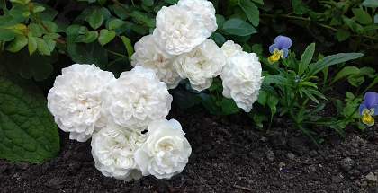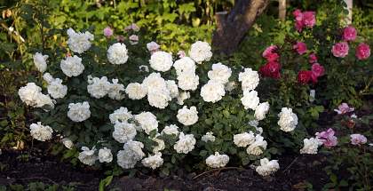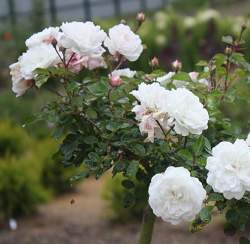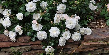 Роза Snowfield (Сноуфилд). Очень неприхотливый сорт почвопокровной розы. Листья мелкие, темно-зеленые, глянцевые. Цветки среднего размера белые (4-5 см), махровые, прекрасно переносят дождь. Куст раскидистый, высотой до 50-70 см, длина побегов может достигать 1-1,5 метров. Цветет обильно в течение всего сезона. Аромат цветков слабый. Высокая устойчивость к заболеваниям.