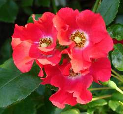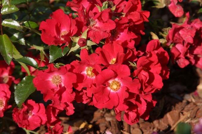 Роза почвопокровная Sommerabend (Зоммерабенд). Превосходный сорт для создания ковровых посадок. Цветки алые с желтыми тычинками. Небольшие (5 см), но в огромных соцветиях — до 50 шт. Лепестки волнистые, общее впечатление от розы — нарядная! Очень хорошо самоочищается.
