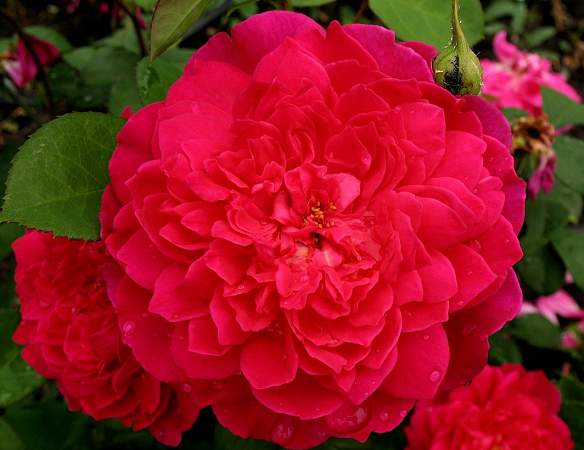 Роза Sophy's Rose (Софи Роуз). Лепестки мелкие в центре, к краям постепенно увеличиваются в размере, — и к краям они довольно крупные, малиново-пурпурные, с более светлой нижней стороной. Это особенно заметно в центре цветка, где лепестки загибаются, образуя пуговку. В результате получается необычный цветок, похожий на георгин.
