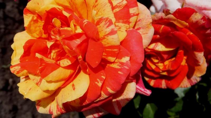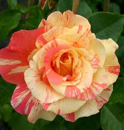 Роза Sorbet Fruite (Сорбэ Фрут). Цветок необычной полосатой расцветки, со временем меняет цвет. Бутоны — яркие, абрикосового тона, в роспуске — нежно розовые с белыми разводами.