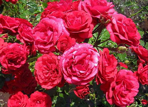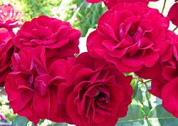 Роза Stromboli (Стромболи). Отличный шраб. Тип цветения — флорибунда. Ярко-красные, махровые, чашевидной формы цветки появляются в кистях по 3-10 шт. Оттенок цветка ближе к вишневому. Лепестки бархатистые, рифленые, хорошо переносят дождь. Цветки распускаются медленно, долго держатся на кусте, сохраняя при этом прекрасную форму, отлично контрастируют с яркой, блестящей, темно-зеленой листвой.