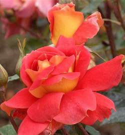 Роза чайно-гибридная Sultane (Султан). Куст средний, с темными листьями. Цветки красно-желтые (нежно-желтые с оборотной стороны лепестка), махровые (до 40 лепестков), диаметром 8-10 см.