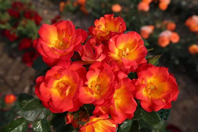 Роза флорибунда Summer of Love (Саммер оф Лав). Название переводится как "Лето любви". Цветки диаметром 6-7 см, полумахровые (9-16 лепестков), ярко-жёлтые с вишнёво-красной каймой, в соцветиях. Лепестки долго не облетают.