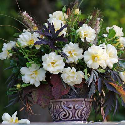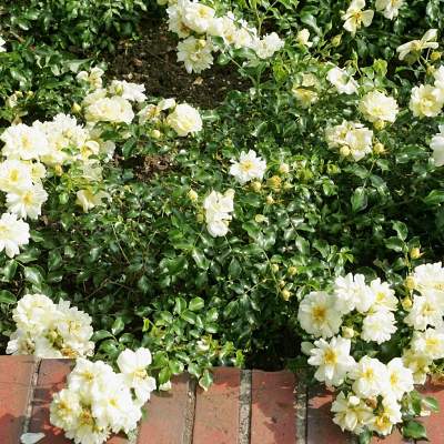 Роза Sunny Rose (Санни Роуз). Выносливая низкорослая роза, чудесное дополнение в желтых тонах для любого сада. Цветки светло-желтые, выгорают до кремовых, махровые, в кистях.