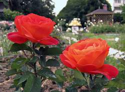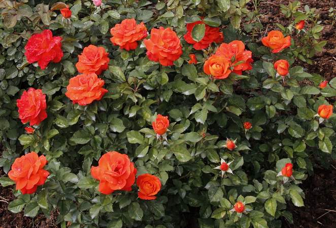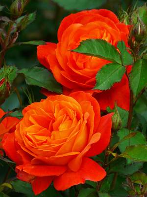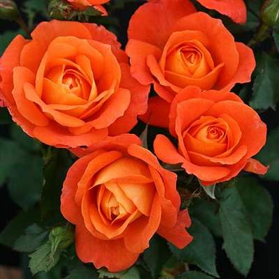 Роза флорибунда Super Trouper (Супер Трупер). Роза с сияющими медно-оранжевыми цветками, цветет все лето до первых морозов. Цветки держат окраску в любую погоду, не выгорают. Бутоны бледно желтые, по мере роспуска меняют окраску на ярко-оранжевую.