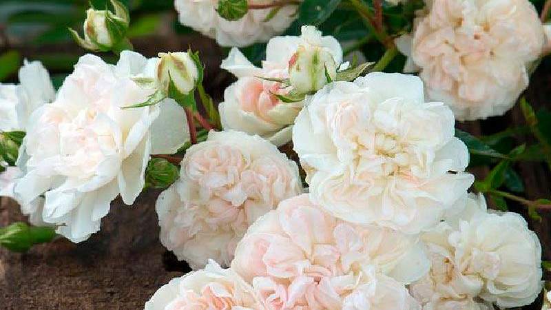 Роза Swany (Свани). Цветки чистого белого цвета, с нежно-розовым тоном в центре, когда только распустятся, густомахровые, в форме розеток. Появляются в кистях по 5-20 шт. на довольно длинных стеблях. Листва очень красивая, тёмно-зелёная, мелкая, блестящая, вечнозелёная. Повторное цветение.