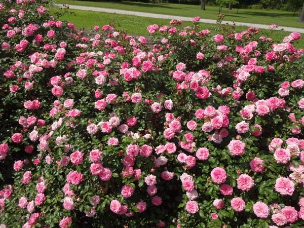 Роза шраб Sweet Drift (Свит Дрифт). Цветки густомахровые, тёплого-розового оттенка, в многочисленных, соцветиях покрывающих куст снизу доверху, что не видно листвы.