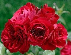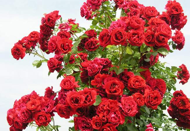 Роза плетистая Sympathie (Симпати). Этот гибрид kordesii второго поколения ярко-красный, с темно-малиновым отливом, что придает цветку роскошный бархатистый блеск. Это оттеняется белыми потеками на лепестках у основания.
