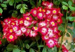 Роза The Bishop´s Rambler (Зе Бишопс Рамблер). Яркий вертикальный акцент в саду. Необычные малиново-красные с белым пятном в середине цветы распускаются в больших соцветиях.