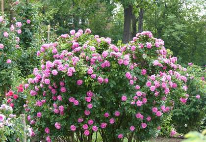 Украшает сад и зимой красвой графикой куста и ярко-красными побегами. Очень легко черенкуется. Сильнорослый куст с длинными побегами, может достигать 2 м в высоту, цветки крупные, махровые, ароматные, ярко-малиновые, позднее выгорают до розовых. Цветет обильно и почти непрерывно весь сезон. Очень зимостойка, выносит бедные почвы и полутень.