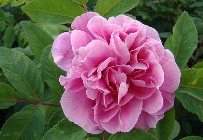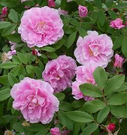 Роза Therese Bugnet (Тереза Багнет). Замечательная роза, не только из-за своей исключительной зимостойкости, но и благодаря крупным, очень душистым цветкам, которые появляются в большом количестве с раннего лета и до поздней осени. Когда внушительный, фонтанообразный куст зацветает первый раз, под цветками практически не видно листьев. Лепестки жатые, как будто из креп-бумаги, нежно-розовые, немного растрепанные.