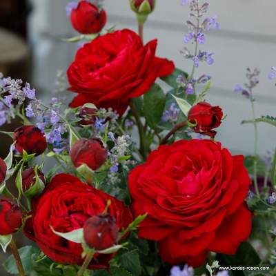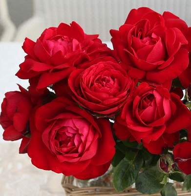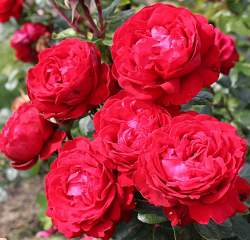 Роза грандифлора Tiamo (Тиамо). Цветки как у чайно-гибридной розы — крупные, но поскольку они не одиночные, а в соцветиях, розу относят к грандифлорам. Цветки сначала шаровидные, потом чашевидные, в старинном стиле. Размер цветка 10 см. Цвет очень красивый — глубокий красный. Хорошо переносят дождь и жару. Имеют легкий аромат.