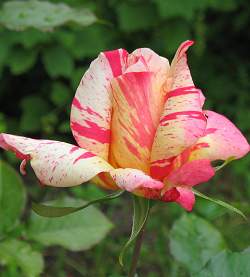 Роза Tocade (Токад). Цвет желтый, с бледно- и темно-розовыми полосками. Цветки бокаловидные, в небольших кистях. Махровые цветки (около 25 лепестков), меняющие свой оттенок на протяжении цветения, создают пеструю палитру на зеленом фоне. Цветки крупные, 10 см. Цветет в течение всего сезона, выраженными волнами, но без цветков не бывает.
